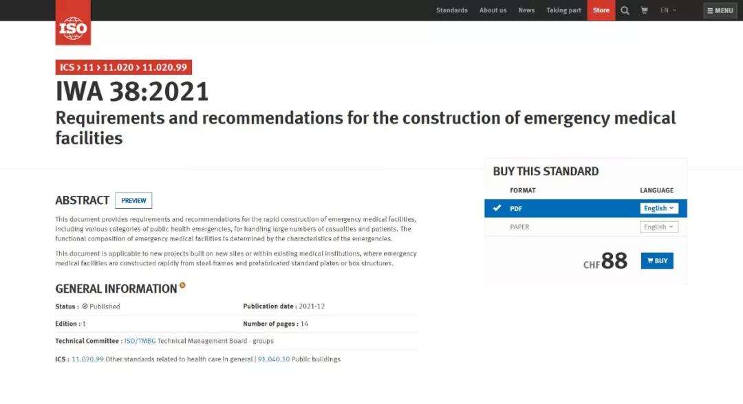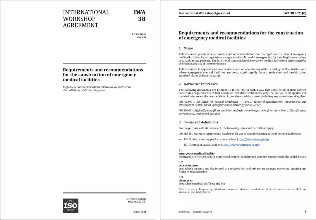 2021年12月20日,国际标准化组织(ISO)官方网站正式发布了开云·体育牵头提出的国际研讨会协议IWA 38《应急医疗设施建设导则》(以下简称“《导则》”)。